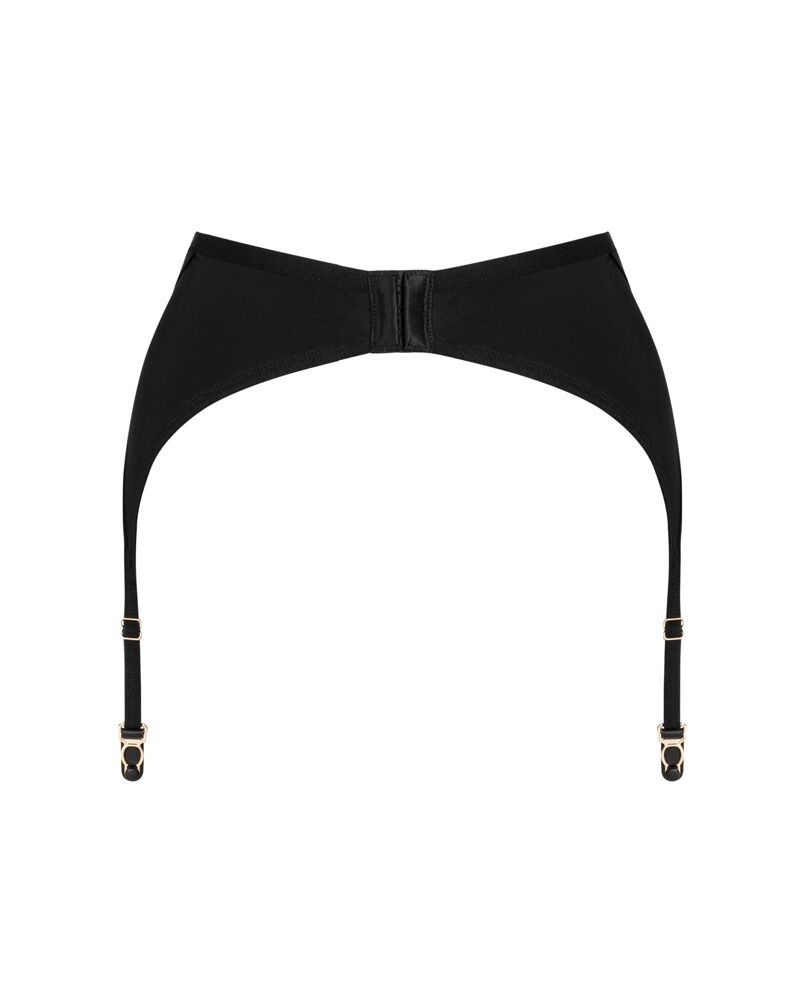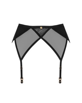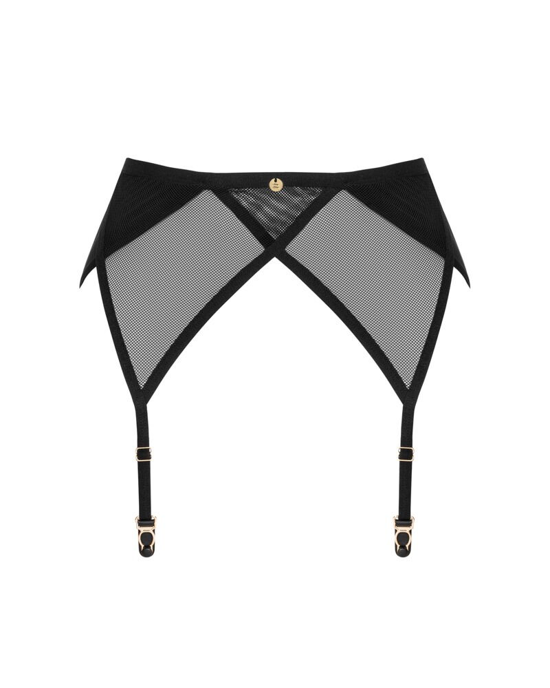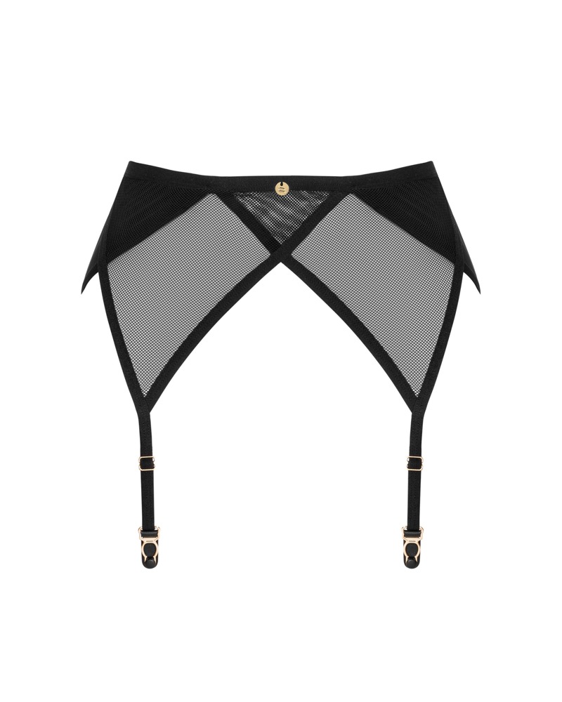 Czarny pas do pończoch Nesari marki Obsessive uwodzi delikatną, miękką przezroczystością siateczki połączoną z miękkim, kryjącym materiałem elastycznym. Detale w złotym kolorze przyciągają spojrzenia. Wygodna regulacja rozmiaru dzięki wielostopniowemu zapięciu i regulowanym paskom do pończoch.