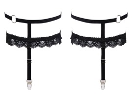 Svart, dubbelt strumpeband från Cottelli Accessoires med avtagbara strumphållare. Av mjuk sammet med silverfärgade ringar och fin spets. Mjukt och elastiskt så att det sitter perfekt. Strumphållarna kan justeras i längd. 1 par.