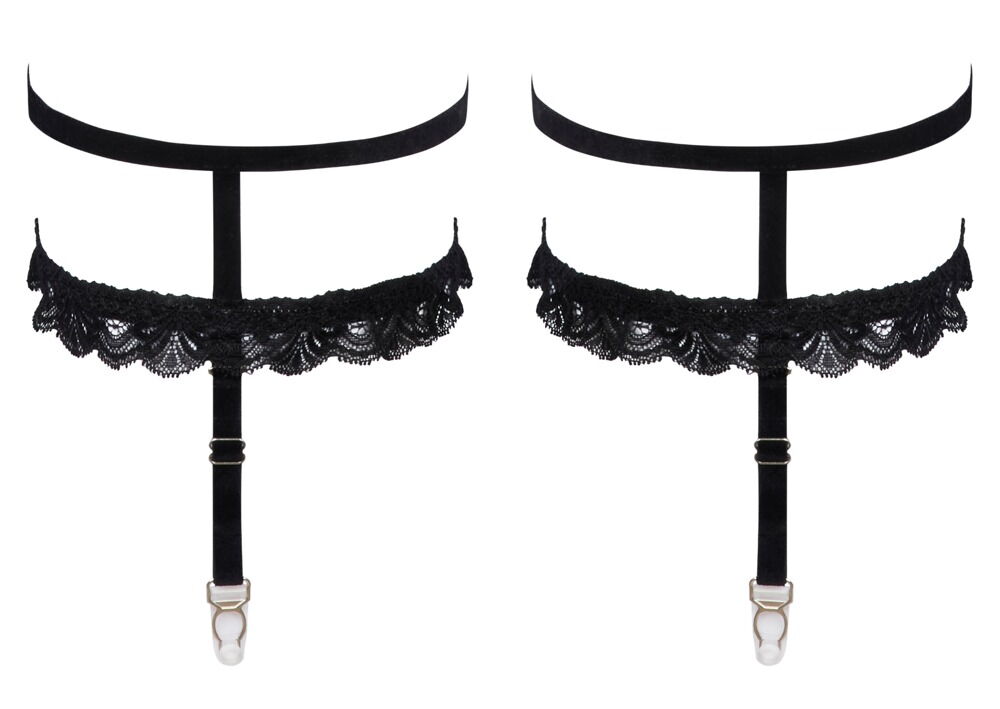 Czarna podwójna podwiązka od Cottelli ACCESSOIRES z odpinanymi paskami do pończoch. Wykonana z miękkiego aksamitu ze srebrnymi pierścieniami i delikatną koronką. Elastyczna na całej długości dla idealnego trzymania. Paski do pończoch mają regulowaną długość. 1 para.