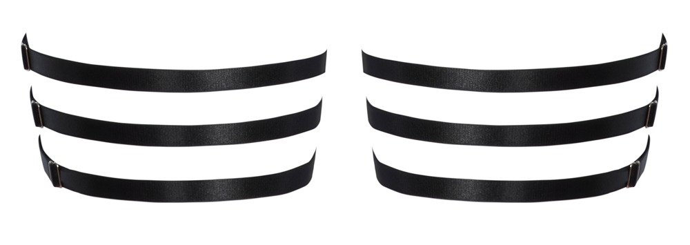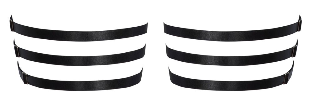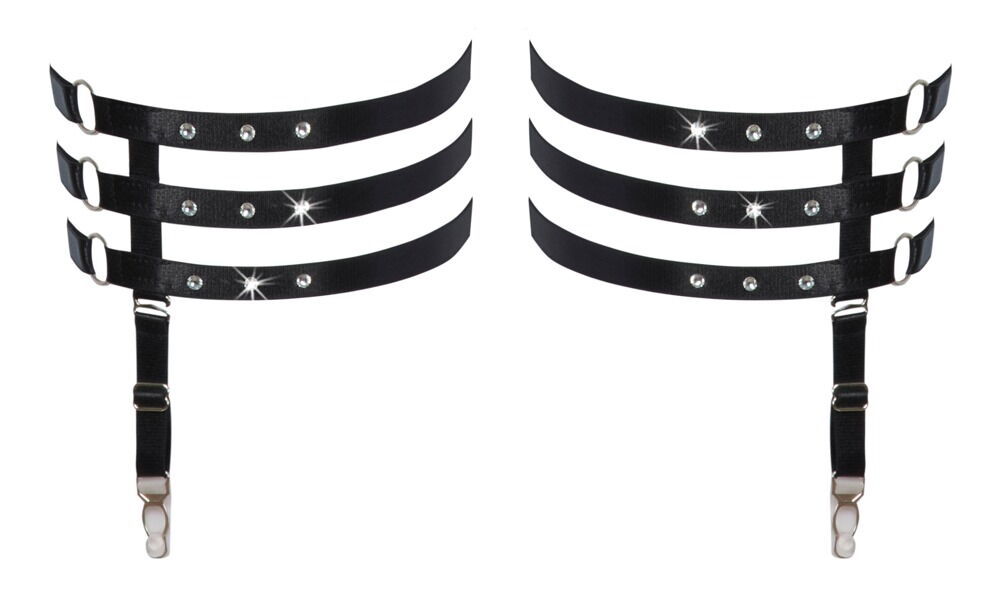 Svart, trippelt strumpeband från Cottelli ACCESSOIRES med avtagbara strumphållare. Av mjuka stretchremmar med ädel glans. Med silverfärgade ringar och strasspynt. Justerbart för perfekt passform. Även strumphållarna kan justeras. 1 par.