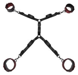 Every bed can be turned into a bondage playground with the bed restraint set Sweet Anticipation Under Mattress Restraint Set from Fifty Shades of Grey. The cross that is made up of adjustable straps fits underneath any mattress. The handcuffs and ankle cuffs can be attached to the straps because there is a D-ring and a snap hook at the end of each strap. The softly padded handcuffs and ankle cuffs can be worn both ways: one side is in a black leather look and the other side is in a black/red satin rose design. All restraints can be adjusted with buckle fasteners.
