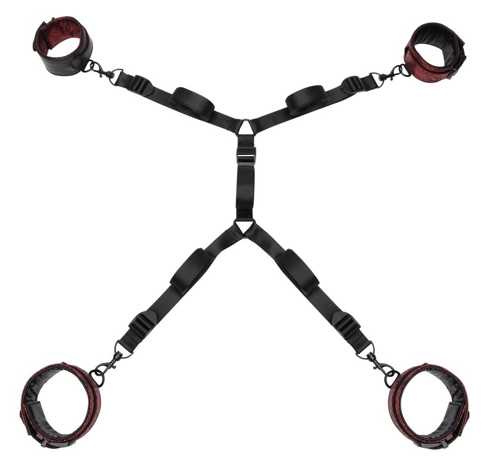 Verander elk bed in een bondage speelplaats met deze Sweet Anticipation Under Mattress Restraint Set van Fifty Shades of Grey. Het verstelbare bandkruis past onder elke matras. De uiteinden van de riemen - elk met een D-ring en karabijnhaak - worden vervolgens vastgehaakt aan de banden voor handen en voeten. De comfortabel gevoerde hand- en voetboeien kunnen aan beide zijden worden gedragen: Een zijde in zwart lederlook, andere zijde met satijn in zwart/rood rozendessin. Elk kan worden aangepast met een gespsluiting.