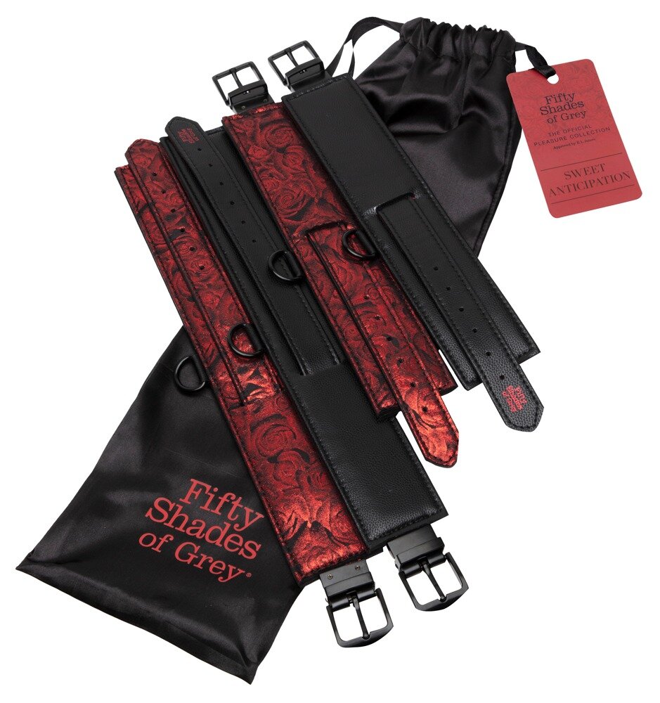 Zamień każde łóżko w miejsce niewoli dzięki zestawowi do krępowania pod materacem Sweet Anticipation z filmu Fifty Shades of Grey. Regulowana taśma krzyżowa pasuje pod każdy materac. Końce taśm - każda z nich z D-ringiem i karabinkiem - są następnie zaczepiane na pasach do przytrzymywania rąk i stóp. Wygodnie wyściełane mankiety na ręce i nogi mogą być noszone po obu stronach: Jedna strona z czarnej skóry, druga strona z satyny w czarno-czerwony wzór róż. Każdy z nich można dopasować do siebie za pomocą zapięcia na klamrę.