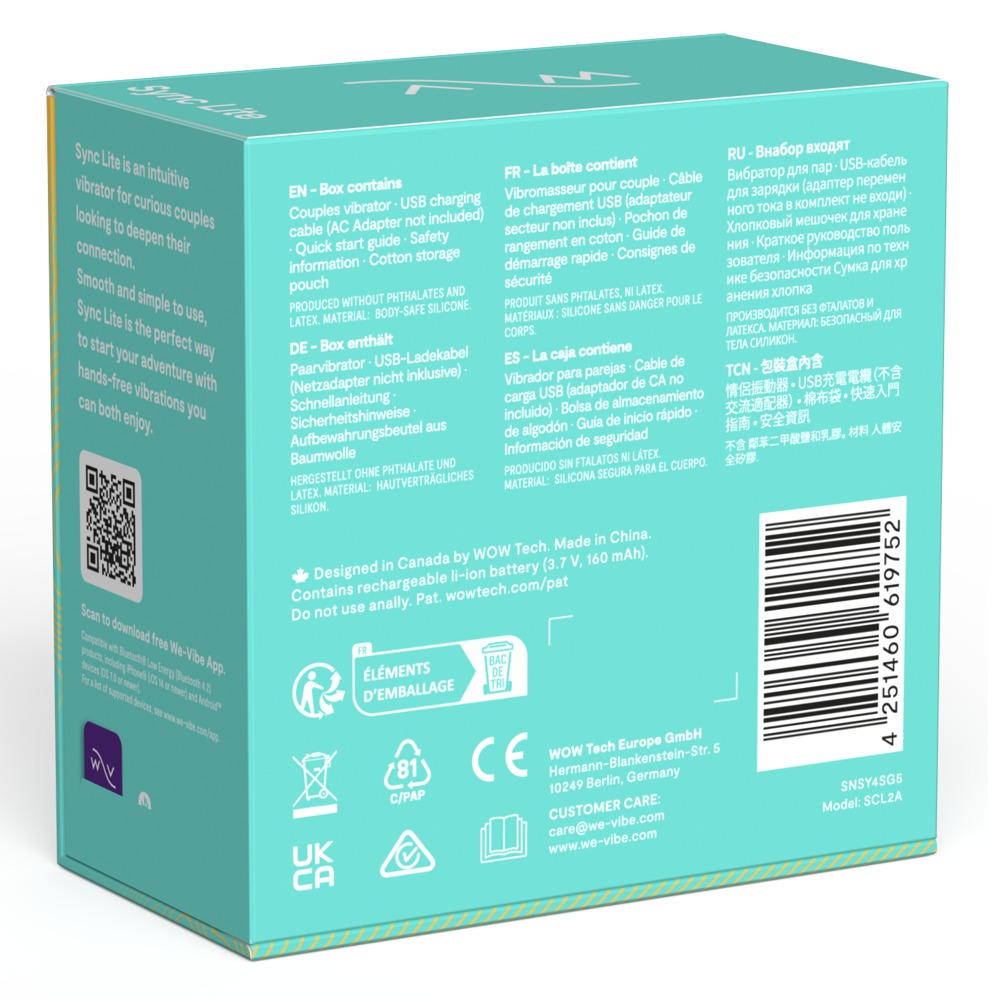 Il Sync Lite è compatibile con l'app We-Vibe per IOS e Android tramite Bluetooth. Oltre a controllare le modalità di vibrazione, è possibile creare programmi di stimolazione personalizzati e controllare comodamente le vibrazioni tramite lo smartphone. È inoltre possibile sincronizzare le vibrazioni a ritmo di musica. L'app We-Vibe consente anche di avvicinarsi sessualmente a distanza. Nell'app sono integrate anche ulteriori funzioni vocali, di chat e video.