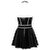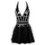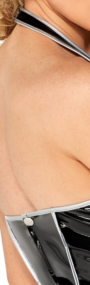 Short halterneck dress from Black Level in black vinyl with silver-coloured decorative seams in a waisted bodice look. Off-the-shoulder and backless, tight-fitting top with a plunging neckline and wide flared skirt. Halterneck with press stud fastening. Back with press stud and zip fastening.