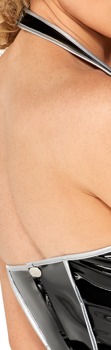 Kurzes Neckholder-Kleid von Black Level im schwarzen Lackglanz mit silberfarbenen Ziernähten in taillenbetonender Korsett-Optik. Schulter- und rückenfreies, eng anliegendes Oberteil mit tiefem Dekolleté, Rockteil weit ausgestellt. Neckholder mit Druckknopfverschluss. Im Rücken mit Druckknopf- und Reißverschluss.