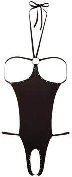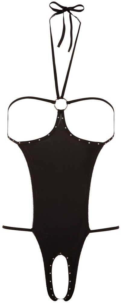 Sexy body with halterneck that ties. Open cups and open crotch that are decorated with rhinestones. There are only straps at the back. Black. 85% polyamide, 15% spandex.