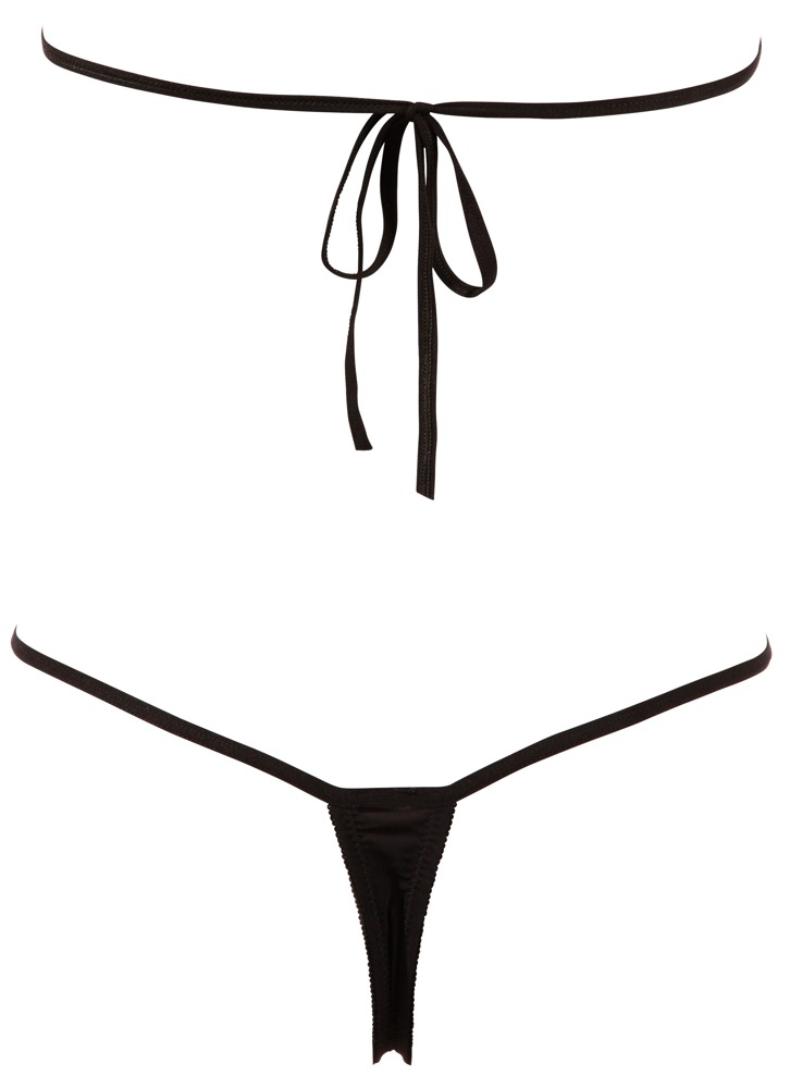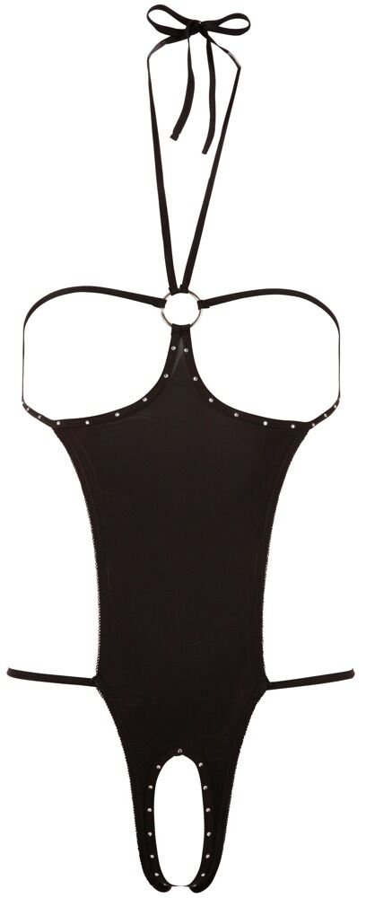Sexy Einteiler mit Neckholder zum Binden und Strassverzierung an den offenen Cups und dem offenem Schritt. Hinten nur Strings. Schwarz. 85% Polyamid, 15% Elasthan.