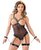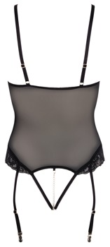 Brystfri stroppe-body lavet af powernet og blonder med metaldetaljer og wetlook tilbehør. En aftagelig stimulerende kæde løber gennem det helt åbne skridt. Justerbare stropper, strømpeholdere justerbare og aftagelige. Remme og manchetter med velcro. Sort.