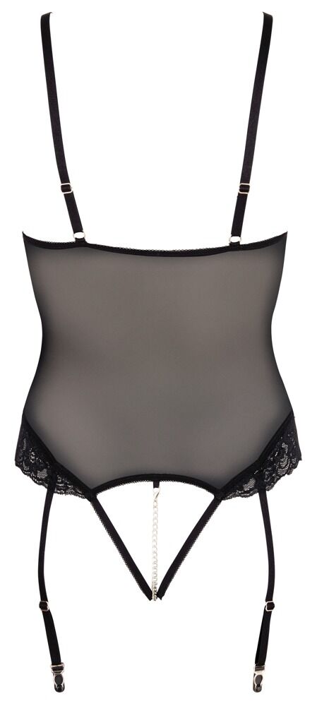 Busenfreier Strapsbody aus Powernet und Spitze mit Metalldetails und Wetlook-Accessoires. Durch den komplett offenen Schritt verläuft eine abnehmbare (Karabinerhaken), stimulierende Kette. Träger verstellbar, Strumpfhalter verstell- und abnehmbar. Oberschenkelriemen über kurze Kette mit abnehmbaren (Karabinerhaken) Handfesseln verbunden. Riemen und Fesseln mit Klettverschluss. Schwarz. 90% Polyamid, 10% Elasthan; Wetlook 92% Polyester, 8% Elasthan.