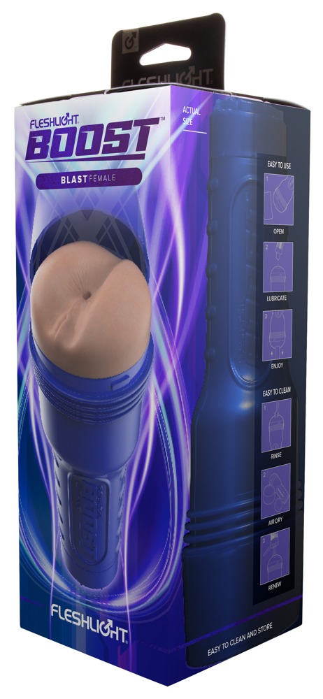 Easy-grip Boost Blast masturbator van Fleshlight in een discrete behuizing met een levensecht gedetailleerde anusopening. Interne drijvende Turbo Tech ringen omsluiten de penis stevig en zorgen voor een perfecte grip. De zeer divers gestructureerde binnenkant met verschillende diameters masseert de penis intensief en orgastisch tijdens een handjob. Met de bijgeleverde Suction Control Cap kun je het zuigeffect eenvoudig individueel regelen.