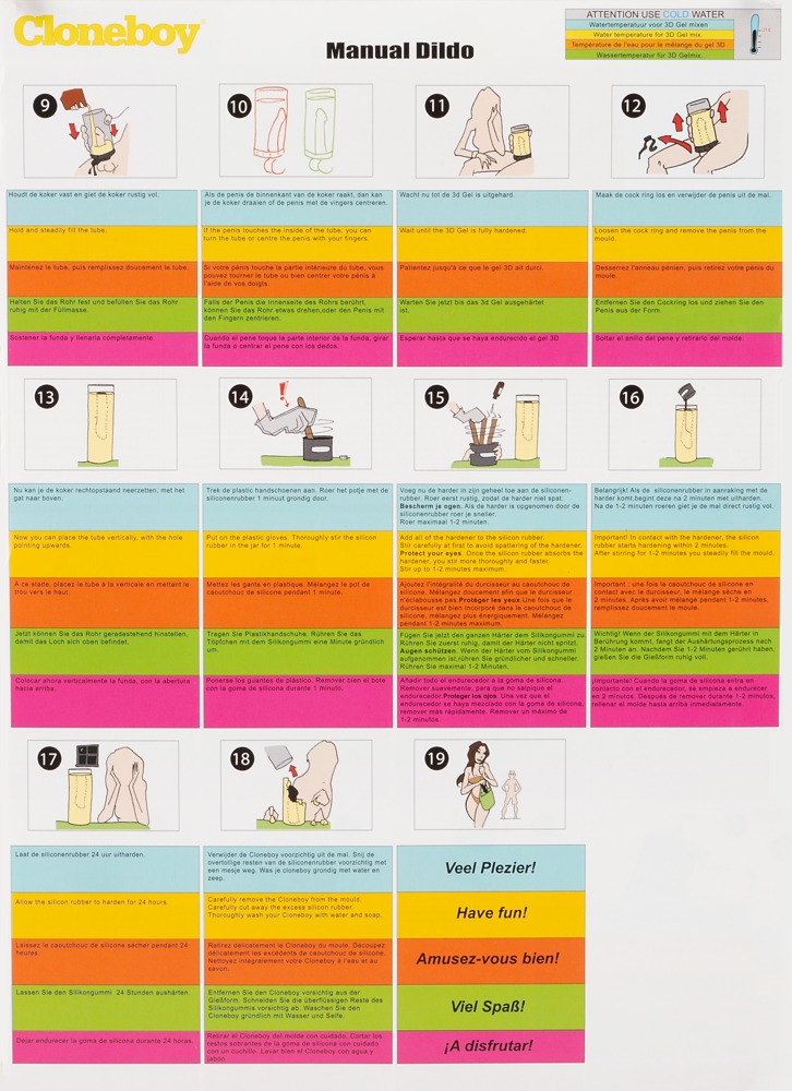 Kit de clonar para pene (erecto) hasta 20 cm de largo y Ø hasta 4 cm. Contiene: molde, cinturón de pene, manguito, 1 x endurecedor, 2 x gel 3 D, 1 x goma de silicona, guantes de plástico, espátula de madera, instrucciones.