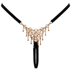 Lussuoso perizoma nero senza cavallo di Cottelli LINGERIE, realizzato con nastri morbidi e molto elasticizzati. Sia il triangolo anteriore che quello posteriore sono realizzati in maglia filigranata color oro bianco con anelli, borchie a sfera oscillanti, catene e pietre scintillanti. Regolabile ai lati della cintura. Seducente apertura sul cavallo.