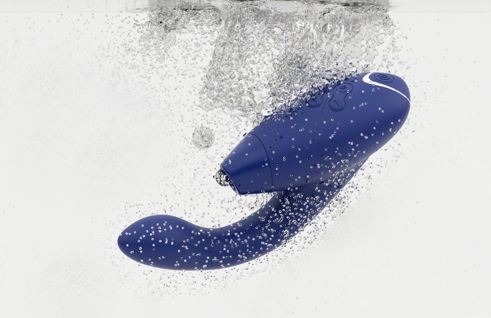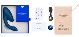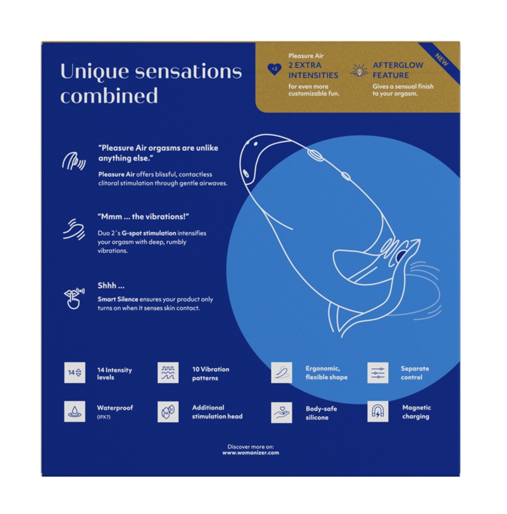 DUO2 fra Womanizer kombinerer den revolusjonære Womanizer Pleasure Air teknologien med kraftig G-punkt stimulering. Den klassiske Womanizer-hetta stimulerer klitoris mens den fleksible vibratorarmen tilpasser seg kvinners anatomi og pirrer den heite innvendige erogene sonen .