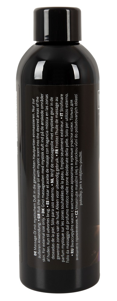 Erotisk massasjeolje med stimulerende mystikduft, som fra 1001 natt. Førsteklasses innholdsstoff, som gjør huden silkemyk og smidig for lang massasjenytelse. Og den erotiserende duften gir lyst på lidenskapelig kamasutra- og tantrasex. Vannløslig og kan lett vaskes av.