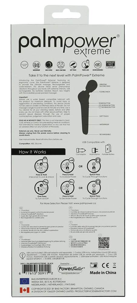 Ergonomiskt formade massagestaven palmpower extreme med flexibel spets och 7 kraftiga vibrationsmodus. Med praktisk knappspärr pch automatisk avstängning efter 15 minuter. Vattentät.