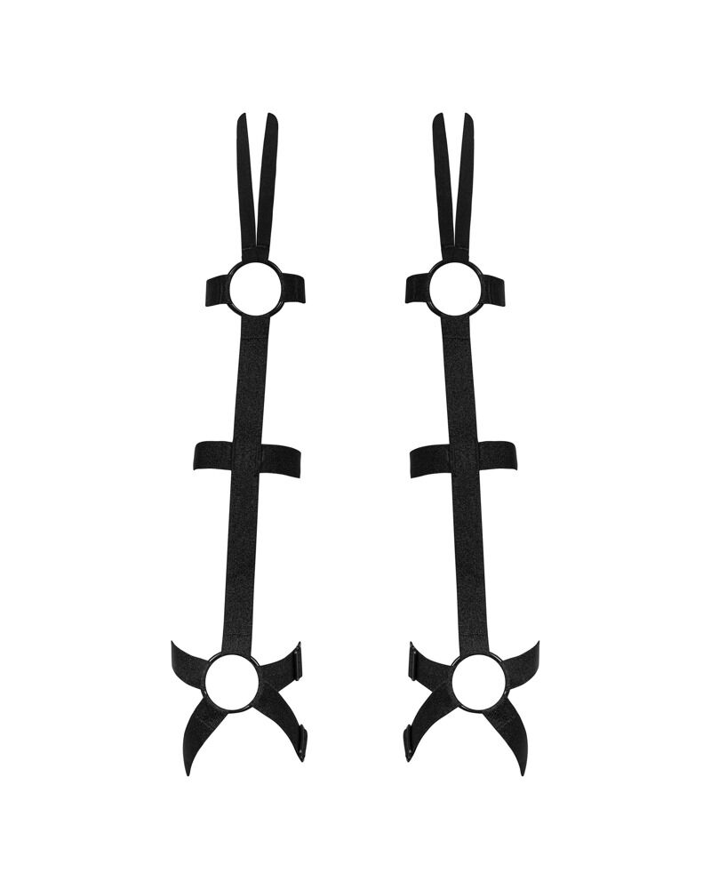 Un par de brazaletes negros Armares de Obsessive con aspecto de tirantes, anillas decorativas y trabillas para los dedos. Se ajustan perfectamente y con suavidad, desde la mano hasta por encima del codo. Y son multiajustables para un ajuste firme y perfecto. Un toque muy especial para muchos conjuntos.