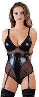 Tuta corta Diva Exclusive di Noir con maniche lunghe in power-wetlook altamente elasticizzato. Con piccolo collo alto e cerniera sul retro. Sul cavallo è presente un'altra zip in un accattivante colore bianco.