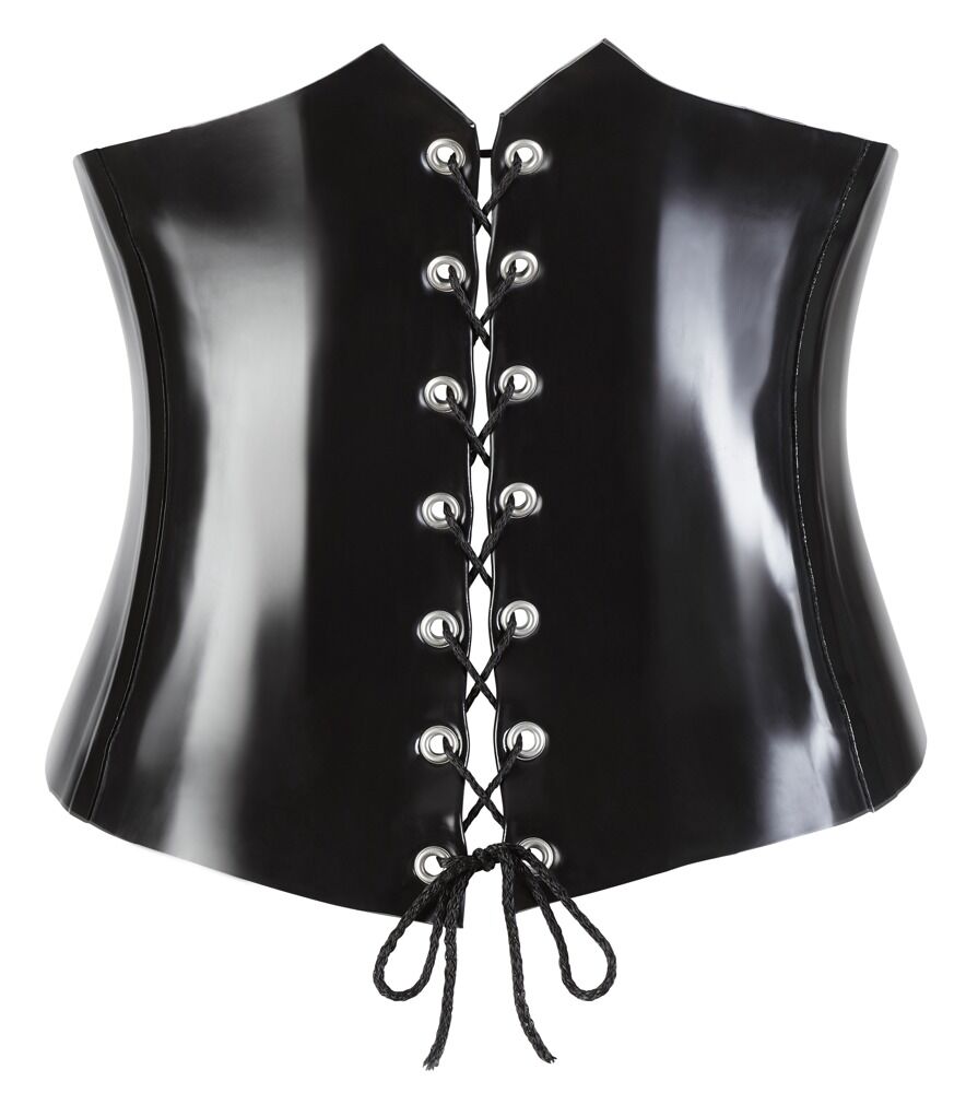 Bredt livstykke i lateks. Et glinsende erotisk plagg, som fremhever livet med formstaver. Hurtiglukking foran og snøring bak. 100% lateks.