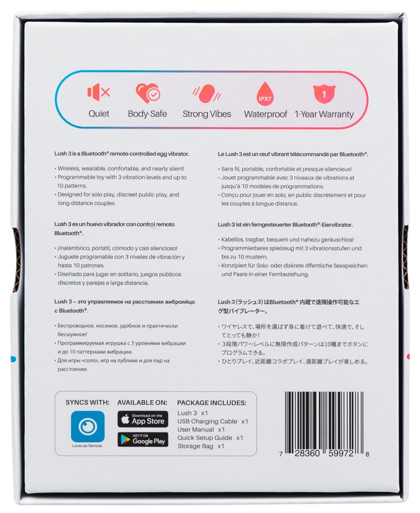Виброяйцо Lush 3 совместимо с приложением Lovense через Bluetooth. Здесь вы можете самостоятельно создавать бесчисленные программы вибрации и удобно управлять и сохранять их через смартфон. Даже от партнера на больших расстояниях. Виброяйцо Lush 3 также может активировать свои вибрации с помощью звука и синхронизировать их с музыкальными ритмами. 4 режима вибрации с 3 интенсивностями также удобно управляются прямо на узком конце игрушки нажатием кнопки.