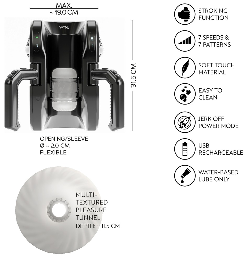 Kraftfuld masturbator 10 fra WYNE, som intensivt masserer og forkæler penis i det op- og nedgående stroker sleeve – over hele længden på op til 28 cm. De praktiske håndtag på siderne giver maksimal komfort og supernem håndtering. Fuldautomatisk komfort-håndjob uden trætte hænder!