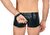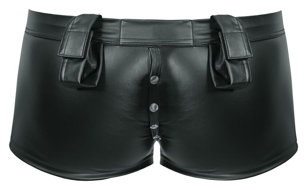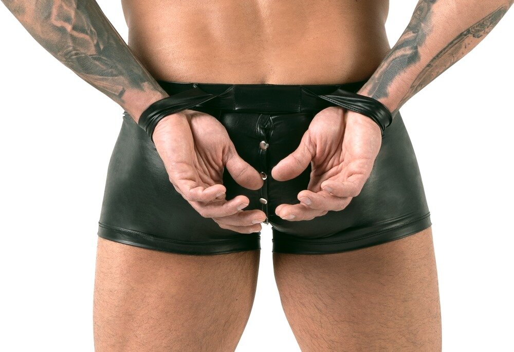 Svart boxer fra Svenjoyment Bondage i edel mattlook. Elastisk og kroppsnær fasong. Med trykknapper foran, gjennom skrittet og over baken. I linninga bak kan de vedlagte lenkene festes for fiksering av armene bak ryggen. Lenkereimene i mattlook har borrelås.
