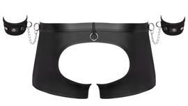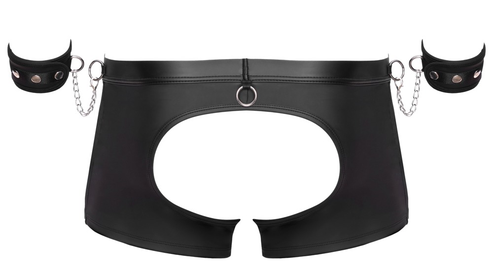 Sorte pants fra Svenjoyment Bondage inklusive bløde håndjern. Spændende numse-fri underbukser i et cool materialemiks af mesh og mat look med sølvfarvede metaldetaljer. Bløde og elastiske for maksimal komfort. Med lynlås i posen. Manchetringe på den overdækkede linning og i siderne, hvor de medfølgende håndjern hurtigt kan hægtes fast med deres karabinhager. De bløde manchetter i mat look kan hurtigt tages på og justeres med velcrolukninger.