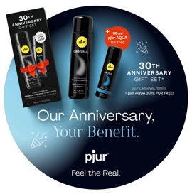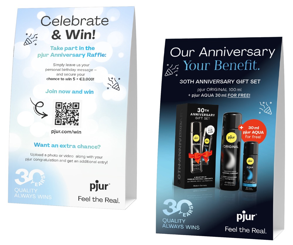 Draw attention to the exclusive 30th Anniversary gift set from pjur, which includes two lubricants for the price of one. 3-piece POS kit consisting of: