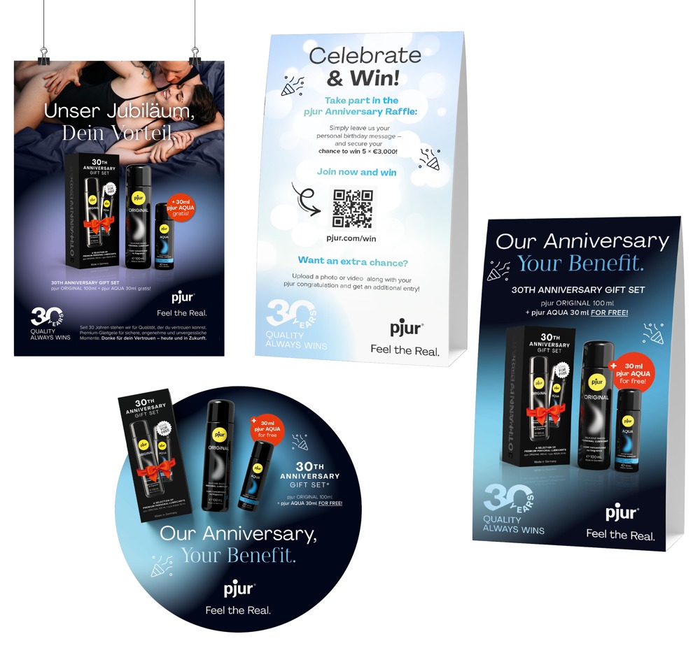 Jetzt auf das exklusive 30th Anniversary Geschenkset von pjur mit 2 Gleitgelen zum Preis von einem aufmerksam machen. 3-teiliges POS Kit bestehend aus: