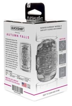 Hendig, liten masturbator Quickshot Autumn Falls fra Fleshlight i gjennomsiktig hylster med deksel. Begge sidene kan penetreres, den ene har vaginaformet åpning, den andre anusformet. Begge er kopier av erotikkstjerna Automn Falls underliv. Lystkanalen er i hudlignende Super Skin materiale, preget med forskjellig pirrestruktur, slik at nytelsen føles som en realistisk lystopplevelse med Automn. Automn Falls har til og med satt underskriften sin på forpakningen.