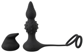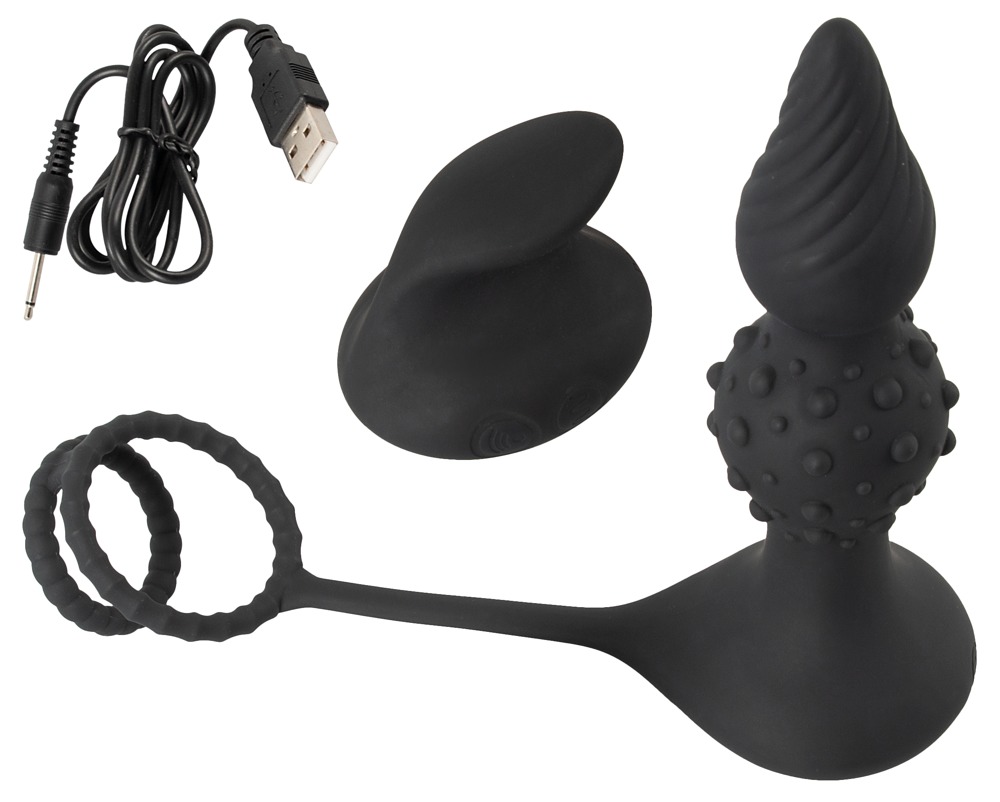 RC Butt Plug with Cock & Ball Rings fra Rebel er en kombinert penis-/pungring med fastmontert vibroanalplugg med fot. Denne justeres enkelt per trådløs fjernkontroll og opp til 10 meters rekkevidde. Det betyr at du også kan gi fra deg kontrollen. Ringene tar et fast grep om penis og pung og støtter mannens ereksjon med den såkalte blodoppdemmingseffekten. Samtidig sørger den innførte vibroanalpluggen for avvekslende og intens pirring bak. Vibroanalpluggen har spesielle nupper og riller og 10 vibrasjonstrinn. Den fleksible forbindelsen mellom ringer og plugg legger seg helt inntil perineum, slik at dette området også stimuleres. Den trådløse fjernkontrollen er ergonomisk formet og kan også brukes som utvendig vibrator, med 10 vibrasjonstrinn per tastetrykk. Ladbar med vedlagt USB-ladeledning.
