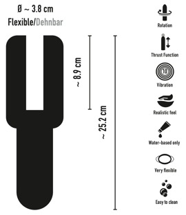 2 stille maar krachtige motoren leveren betrouwbare kracht voor allround plezier. De rotatie- en stuwfunctie voor een intensieve penismassage worden op een opwindende manier gecombineerd. Maar liefst 8 standen zorgen voor de juiste aandrijving voor 360° verwennerij. Bovendien kunnen er 10 verschillende vibratiestanden worden toegevoegd. Alles is eenvoudig te bedienen met de LED-verlichte knoppen op het speeltje.
