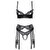 Svart sett med hofteholder, BH, riotruse og strømpebånd fra Cottelli LINGERIE. Alt i myk stretchblonde, strømpebånd av myke stretchstropper. Bøyle-BH med halve, slissede skåler. Justerbare skulder- og strømpestropper. Hofteholder og BH med hektelukking bak. 8 strømpeholdere (6 foran, 2 bak). Riotrusa har dristig åpen front.