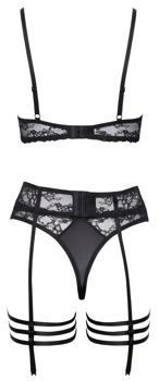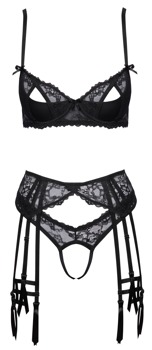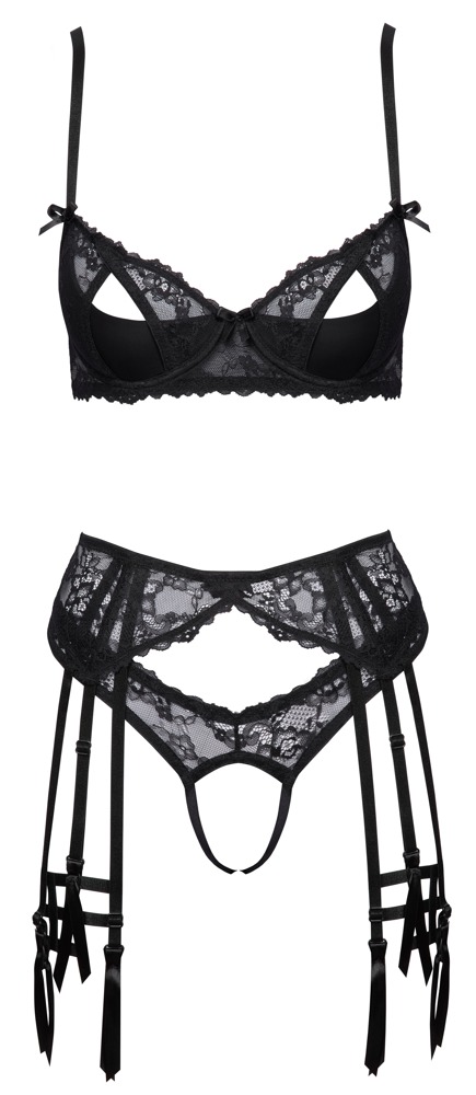 Svart höfthållarset från Cottelli LINGERIE bestående av bygel-behå, höfthållare, riostring och snygga strumpeband. Med fin, mjuk stretchspets, strumpeband av mjuka stretchband. Bygel-behå med halva kupor och spets med sexiga cut-outs. Axelbanden och hakknäppningen kan justeras. Likaså höfthållarens hakknäppning och de totalt 8 strumphållarna (6 framtill, 2 baktill). Riostringen förför med en öppen front.