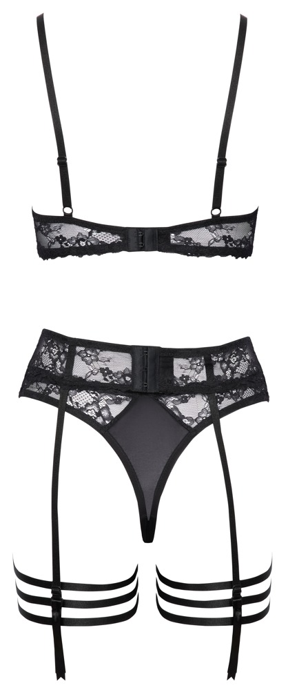 The black suspender set from Cottelli LINGERIE contains an underwired bra, suspender belt, thong and stylish garters. The set is made out of soft, delicate stretchy lace. The garters are made out of soft stretchy straps. The underwired bra with half cups is covered with lace – there are seductive cut-outs in the lace. The bra straps and the hook fastener at the back can be adjusted to fit. The hook fastener at the back of the suspender belt and the total of 8 suspender straps (6 at the front, 2 at the back) can also be adjusted. The thong has a seductive and revealing open front part.