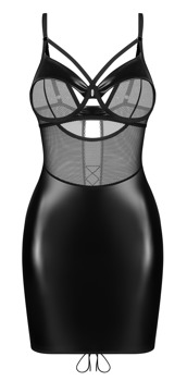 The black Dominna set from Obsessive is made up of a figure-emphasising chemise and a matching thong. The set is made out of a stylish mix of delicate transparent net (top part) and stylish opaque wetlook (skirt part). Everything is soft and stretchy for a very comfortable fit. The chemise has extravagant underwired cups and a hook fastener at the back. There is a small decorative element in between the cups. There is also decorative lacing at the back that goes right down to the hem. The lacing has no material behind it, which means that the back part is therefore very revealing. The bra straps can be adjusted to fit. The matching thong is seductively crotchless and adds the finishing touch to this sexy set.