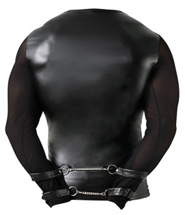 Long sleeve shirt from Svenjoyment Bondage made out of soft, stretchy powernet with a sewn-on harness at the front. The harness has decorative rings on it. The back of the shirt is made entirely out of trendy matte look material. The long powernet sleeves have sewn-on matte look restraints. The included short connection chain with snap hooks can be attached to the rings on the restraints.