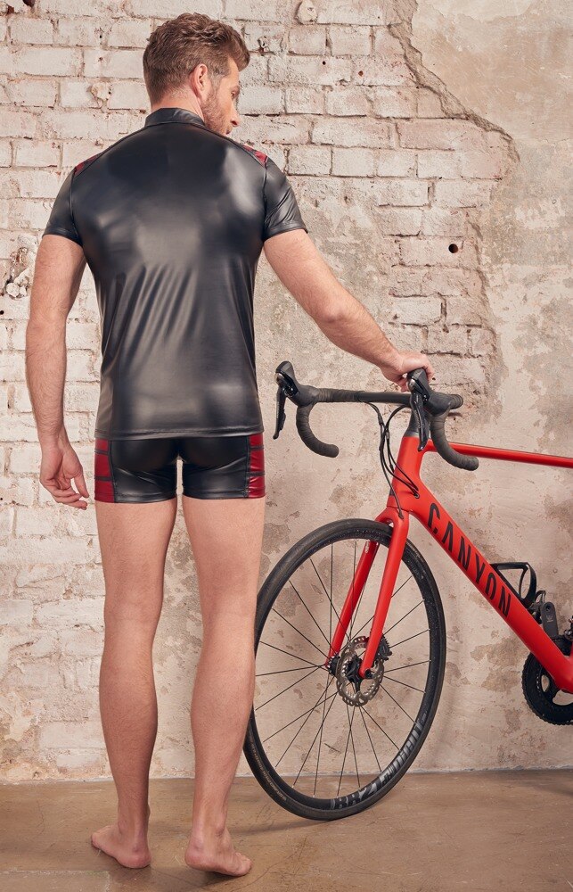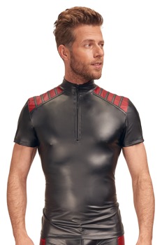 Czarna koszula marki NEK w modnym matowym stylu z czerwonymi paskami na ramionach. Z małą stójką i zamkiem błyskawicznym z przodu. Fantastycznie elastyczne dla doskonałego komfortu noszenia.