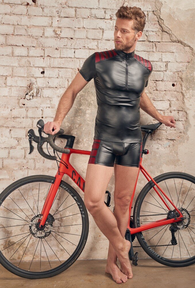 Black shirt from NEK made out of trendy matte look material with red inserts over the shoulders. There is a small stand-up collar and a zip at the front. Wonderfully stretchy pants that are extremely comfortable to wear.