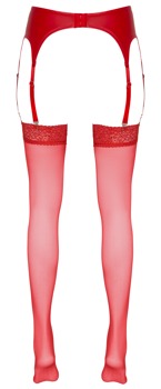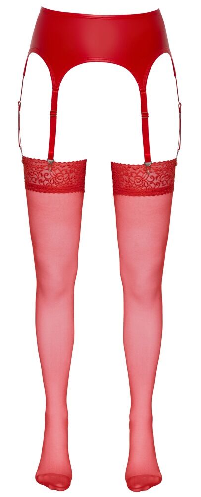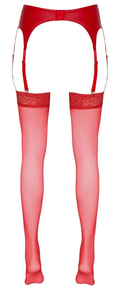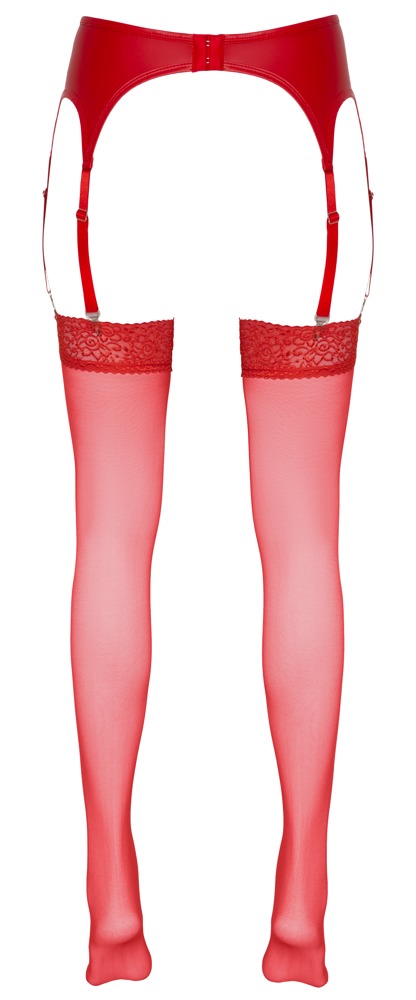 Velvety soft stockings that have to be clipped onto a suspender belt. They are in a really eye-catching red colour and have a 7 cm wide top part. 20 denier. Oeko-Tex certified.