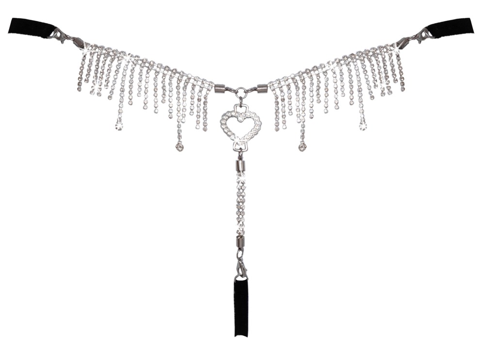 Luxe, zwarte string van Cottelli LINGERIE met een voorkant van delicaat, zacht kant. De achterkant van de string is rijkelijk versierd met strass-steentjes en kettingen. Het weelderige sieraad met het grote strass hart in het midden is volledig afneembaar (om met de hand te wassen). De rekbare bandjes aan de zijkanten van de tailleband kunnen op maat worden versteld.
