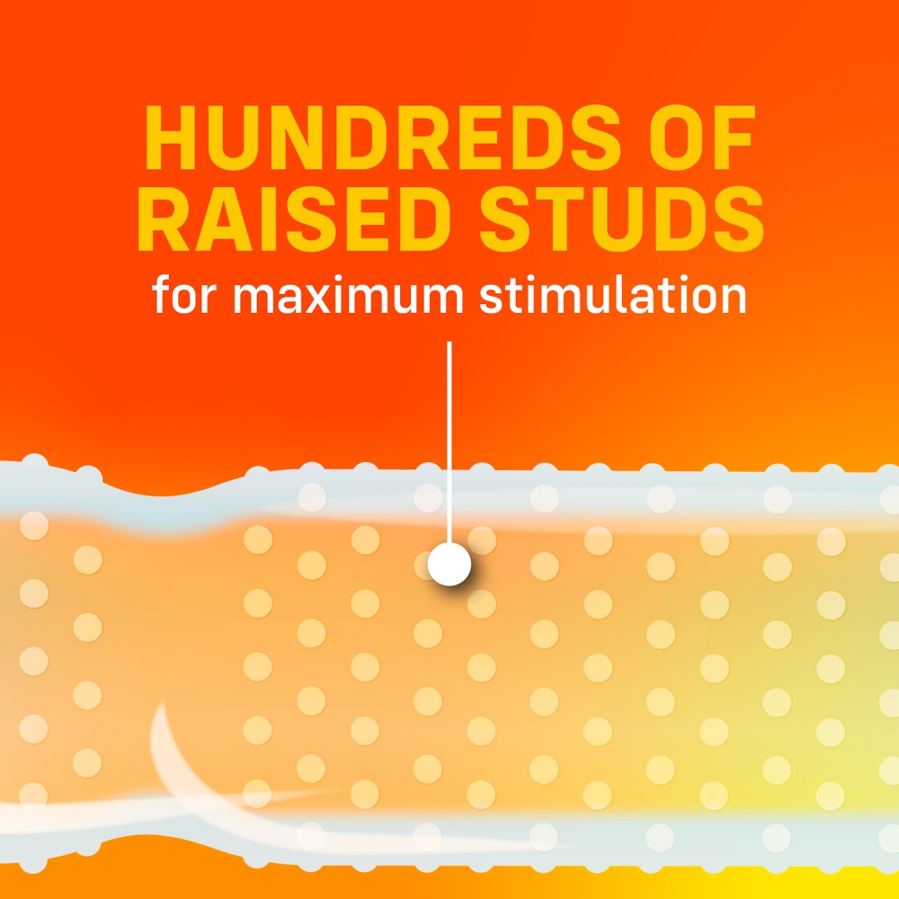 Przezroczyste prezerwatywy Super Studs od ONE z dużymi wypustkami dla intensywnej stymulacji i większej przyjemności. Wyprofilowany kształt ze zbiorniczkiem zapewnia wygodne, bezpieczne dopasowanie - ultra miękki lateks Sensatex z naturalnej gumy zapewnia naturalne uczucie przyjemności. Produkt wegański i wolny od GMO. Nawilżony olejem silikonowym.