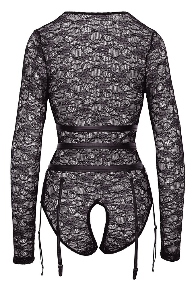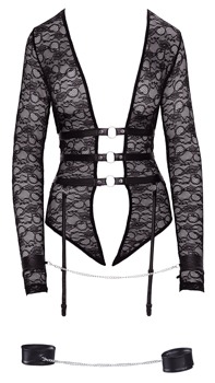 Body i uvanlig form, med åpen front som kun holdes sammen av belter med ringer og strømpestropper. Bodien er i gjennomsiktig blondestoff, og overlater lite til fantasien. De 3 stroppene på hver side gir anledning til å komplettere antrekket med sexy strømper. I denne bodien kan elskoven utvikles tilen lidenskapelig bondagelek med kontroll. Det er bare å ta i bruk de medfølgende hånd- og fotlenkene. De kan forbindes ved hjelp av lenke og karabinkrok.
