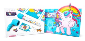 Massagestav Unicorn Wand inklusive enhörnings-dildopåsats och förvarings-/respåse samt vykort, nyckelring, symärke och klistermärke med regnbåge- och enhörningsmotiv. Även inklusive: laddningskabel med 4 olika elkontaktsadaptrar så att du kan ta med massagestaven på resan.