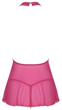 Krótka babydoll marki Cottelli LINGERIE w różowej przejrzystości wykonana z delikatnej koronki (góra) i powernetu (spódnica). Miękkie i elastyczne dla wysokiego komfortu noszenia. Przód z głębokim dekoltem typu keyhole pod koronkowym halterneck. Bez pleców, halterneck z zapięciem na szyi. W zestawie znajdują się pasujące stringi.