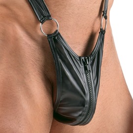 The tight-fitting, black, string body from Svenjoyment has long sleeves. It is in a provocative style because it is made out of opaque matte look with transparent powernet inserts. It is soft and stretchy for a very comfortable fit. There is a large cut-out with rings at the front. The body also has a stand-up collar and zip over the chest. There is also a padded zip over the pouch.