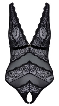 Elastisk, åpen riobody fra Cottelli LINGERIE i en finmasket, myk materialmiks av powernet og blomsterblonde. Dypt utringet med strasselement på under-bryst-båndet i fløyel. Forførerisk åpent skritt. Hektelukking bak. Justerbare stropper.