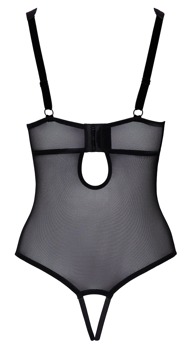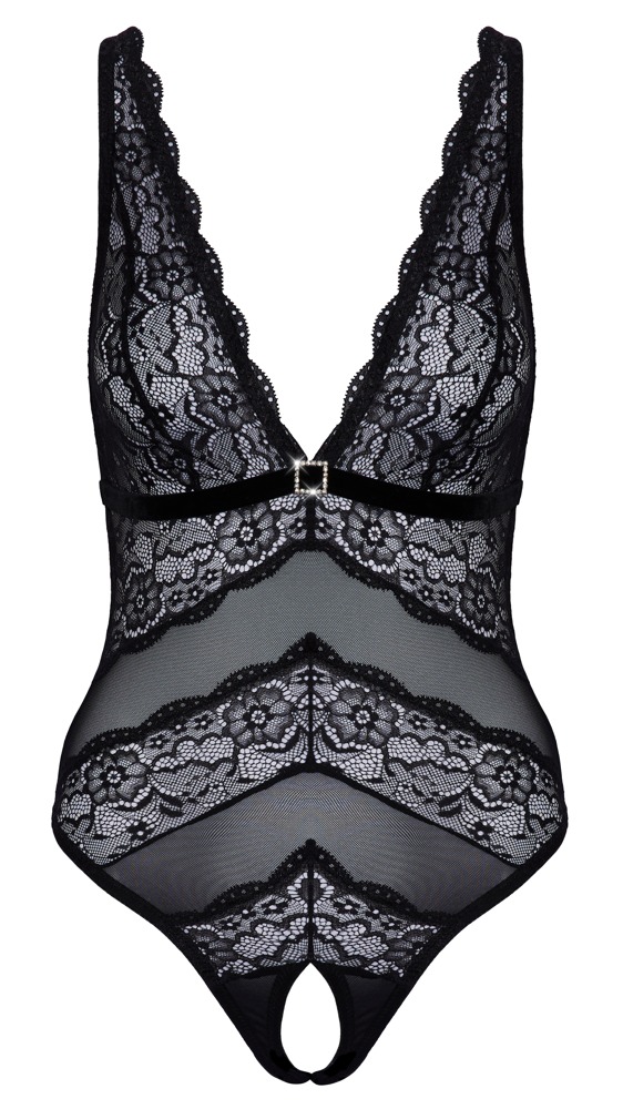 Crotchless body from Cottelli LINGERIE in a delicate material mix of powernet and floral lace. With a beautiful deep neckline. A rhinestone element sparkles below the velvet underbust band. The crotch is seductively open. Powernet back with adjustable hook fastening. The straps are also adjustable for a perfect fit.