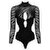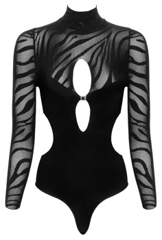 Snug long-sleeved bodysuit by Cottelli FANTASY. Seamlessly made of fine soft stretch material with elastic stand-up collar. Semi-transparent top with woven imaginative striped pattern, otherwise opaque, also over the bust. Front and sides with beautiful cut-outs, front additionally decorated with glittering rhinestone detail. Crotch with press stud fastening.