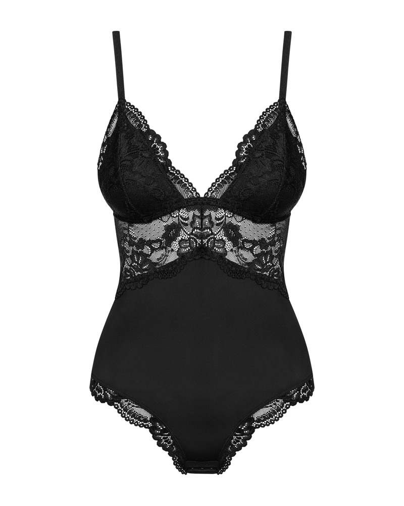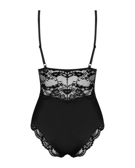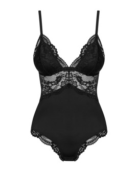 Prachtige zwarte bodysuit 810-TED-1 van Obsessive gemaakt van zacht stretchmateriaal gecombineerd met fijn elastisch kant. Zeer comfortabel om te dragen! Ondoorzichtige gewatteerde kanten cups. De bandjes zijn verstelbaar. Haaksluiting in het kruis.